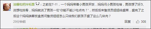 之前在7-11,一個媽媽帶着小男孩買飯,媽媽問小男孩吃啥,男孩想了好久説想吃排骨,媽媽就説了男孩一句“你能不能少吃點肉?”,然後後來售貨員姐姐給盛菜,盛完了之後這個媽媽端着飯盒質問售貨姐姐怎麼只給我們家孩子盛了這麼幾塊肉?