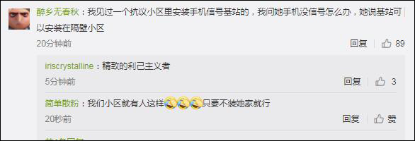 我見過一個抗議小區裏安裝手機信號基站的,我問她手機沒信號怎麼辦,她説基站可以安裝在隔壁小區