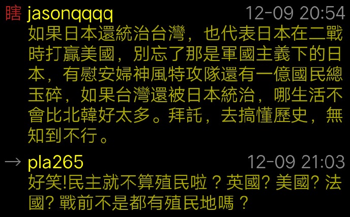 如果學過歷史的人都能夠看得清楚,“如果日本還統治台灣,也代表日本在二戰時打贏美國,別忘了那是軍國主義下的日本,有慰安婦、神風特攻隊……如果台灣還被日本統治,哪(那)生活不會比北韓(朝鮮)好太多”;