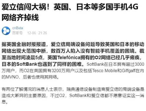 再來,就在禁用華為當天,日本三大運營商之一的軟銀,通信設備出現了故障,一半的島民收不到4G信號。