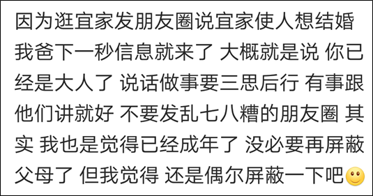 有的人本來是不屏蔽的,但是呢,因為爸媽永遠不知道你其實在一本正經的胡説八道,他們會因為你的朋友圈而孜孜不倦地教你做人……