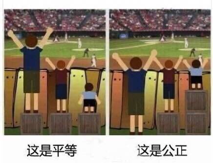 但一層住户又會説:我也願意出資與大家一起享受收益啊,但是即使我出資了也沒法與大家享受同等收益,所以這即使是公平的也是不公正的,收益應該要平等分配才是。説到平等、公正,就不得不祭出下面這張圖了: