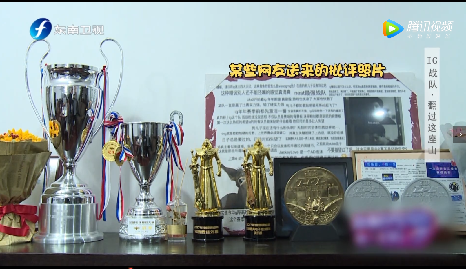 在iG英雄聯盟戰隊的基地裏,魯豫還發現了一件網友送來批評iG的牌子。在牌子上寫滿了網友們對iG的批評,iG英雄聯盟戰隊將這些批評與獲得的獎盃放在一起,算是激勵戰隊的一種方式。
