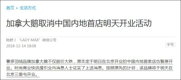 孟晚舟事件後加拿大鵝市值蒸發100億元 中國內地首店開業活動也取消_風聞
