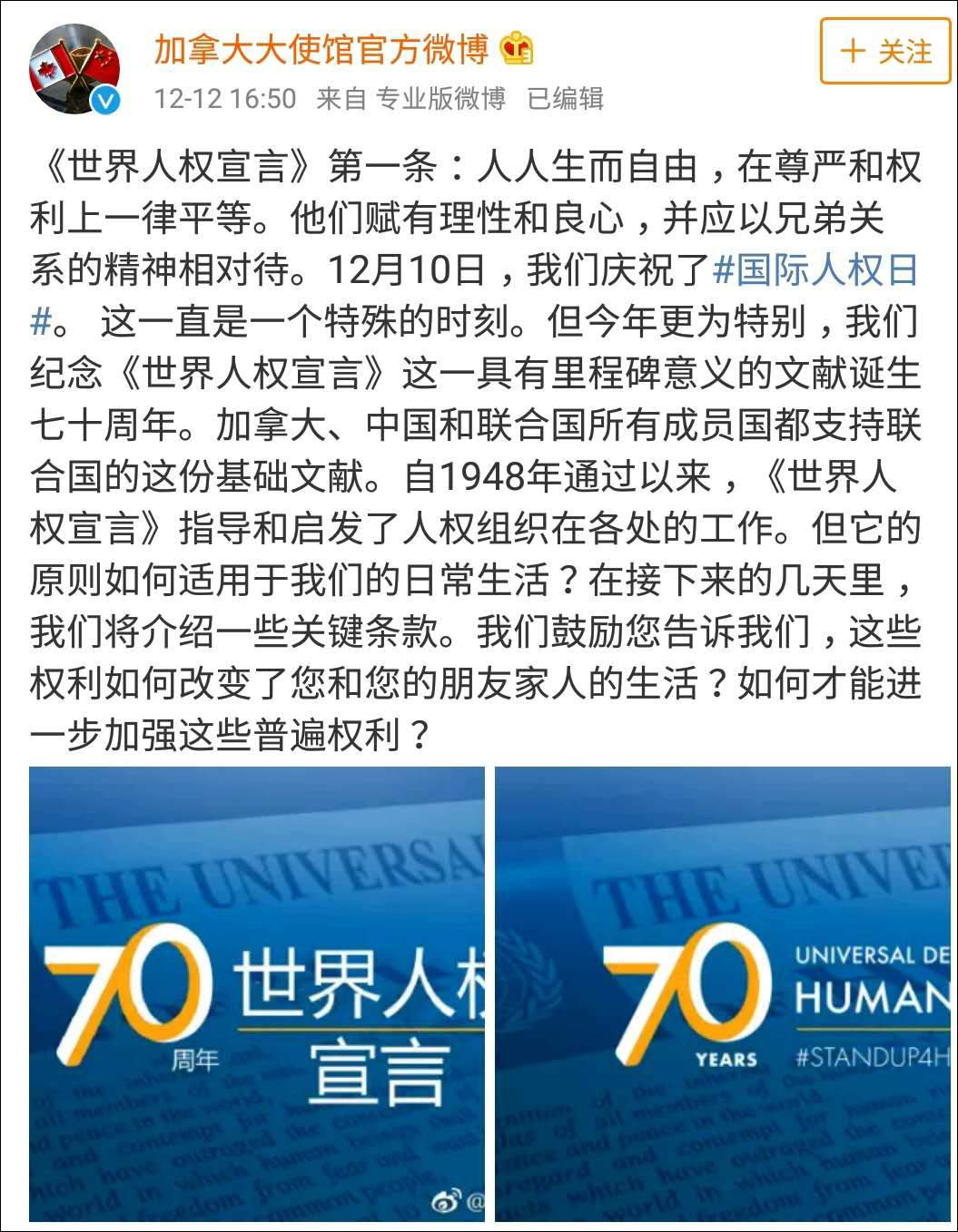 12月10日世界人權日這天,加拿大大使館官方微博發了一條紀念《世界人權宣言》通過的微博,在微博中加拿大大使館表示“讓我們共同維護平等、正義和人的尊嚴”。