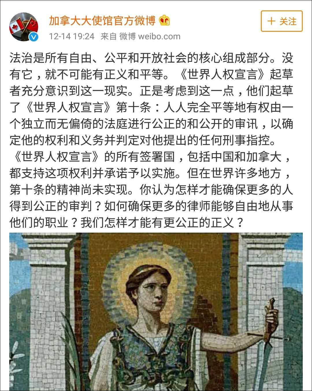 12月14日,也就是今天,加拿大大使館官方微博向中國網友介紹了**《世界人權宣言》的第十條**:人人完全平等地有權由一個獨立而無偏倚的法庭進行公正的和公開的審訊,以確定他的權利和義務並判定對他提出的任何刑事指控。