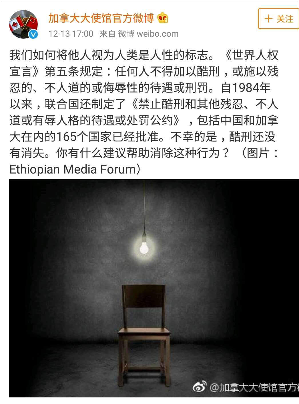 12月13日,加拿大大使館官方微博再次例行發表關於《世界人權宣言》的微博。在這一天的微博裏,加拿大大使館向中國網友介紹了**《世界人權宣言》的第五條**:任何人不得加以酷刑,或施以殘忍的、不人道的或侮辱性的待遇或刑罰。