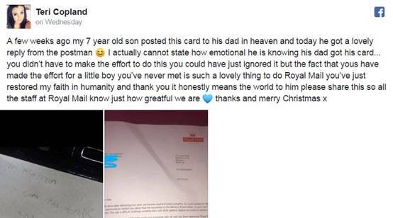隨後皇家郵政在Facebook上也對Teri做出回覆,帖子轉發量超過了20萬。郵遞員Sean之後也主動與Teri聯繫,告知其信件送達的消息,並表示以後仍將盡全力幫助他們送信。