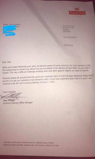 皇家郵政的信中寫道:“在去往天堂的路上,為了避免和其他銀河系物體相撞是個巨大的挑戰。但請放心,這個特別重要的郵件已經交付。皇家郵政的首要任務是讓我們客户的郵件安全送達。我知道你的郵件對你有多重要。我們會盡我所能確保安全送到天堂。”