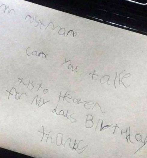 信寫好後,Jase附上了一張便條,上面寫道,“郵差先生,你能不能把這個帶到天堂,今天是我爸爸的生日,謝謝。”