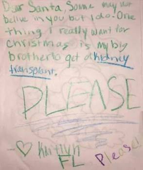 在美國北卡羅來納州,女孩Kaitlyn在給聖誕老人的心中寫下的唯一聖誕願望是,希望哥哥能成功移植腎臟。郵局經理Shelly Thomas隨後在大郵筒上貼出信息並分享到社交媒體上,隨後,女孩兒的哥哥受到社會各界人士的大力幫助,有很多人甚至願意為其捐腎。