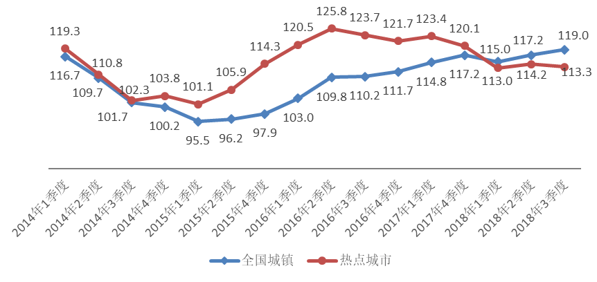 《報告》顯示,房價預期指數持續走高,但一線城市和熱點城市持續下降。2018年三季度全國城鎮居民家庭房價預期指數為119.0,較上季度117.2上升了1.8個點,且為2014年以來最高點,表明城鎮居民預期四季度房價會繼續上漲。然而,一線城市延續了2017年以來持續下降的態勢。此外,熱點城市房價預期自進入2018年後持續低於全國城鎮家庭房價預期水平。16個熱點城市(北京、上海、廣州、深圳、天津、蘇州、成都、鄭州、無錫、濟南、合肥、武漢、南京、福州、廈門和杭州)在本季度的房價預期為113.3,比上個季度下降0.9個點。《報告》同時發現,無房家庭對於房價的預期依然高於有房家庭。(圖7)