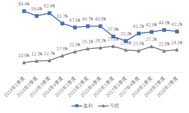 據CHFS數據顯示, 2018年第三季度,全國工商業生產經營盈利比例是43.2%,較上季度下降了近1.6%;虧損比例為24.1%,即有近四分之一工商業生產經營處於虧損狀態,比上季度上升了1.5%,第三季度工商業生產經營形勢有所惡化(圖2)。《報告》指出,税費較高和融資約束是工商業生產經營不佳的重要原因。據CHFS數據分析發現,税費較高和融資約束是小微企業經營不佳的重要原因。央行出台的信貸支持政策使得小微企業信貸可得性增加,融資約束降低,對促進小微企業融資起到積極作用。然而,由於小微企業信貸需求減少,信貸支持政策的受惠空間受到擠壓。CHFS調查發現,約有三分之二的小微企業認為税費負擔重,這正是目前我國小微企業面臨的重大難題。在信貸政策扶持小微企業成長的同時,減税降負將是助力小微企業成長的關鍵,而為此提高增值税起徵點也將進一步拉動經濟。