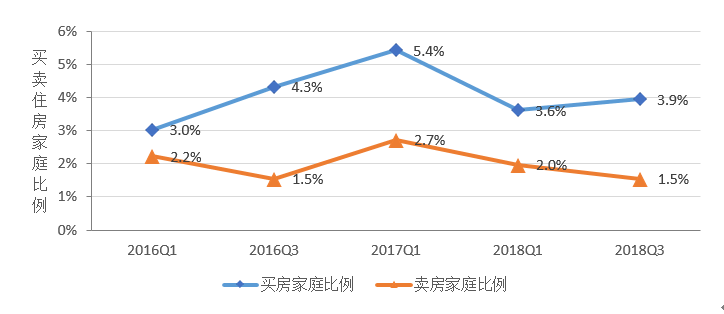 儘管一線城市住房交易遇冷,其餘城市卻更為活躍。2018年第二、三季度,城鎮買房家庭比例增加為3.9%,賣房比例降低至1.5%。受住房市場調控政策影響,賣房家庭比重下降。從參與住房交易的家庭所居住的城市來看,一線城市購房和出售住房的家庭比例最低,其餘城市住房交易卻更為活躍。分不同資產組來看,較高家庭資產組買房的比例最高。從購房目的來看,投資和改善性需求有增加趨勢,剛需逐漸降低。新購房目的中投資用途佔58.2%,比上季度增加,説明目前住房交易以投資為主;改善型需求佔到26.7%,有增加趨勢,説明換房比例增加;剛需僅為15.1%,有降低趨勢。