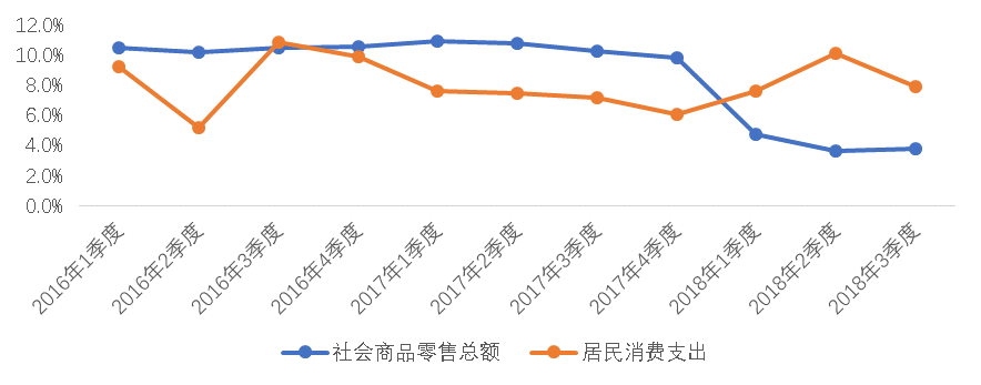 圖 8 社會商品零售總額和居民消費支出增長率(數據來源:統計局)