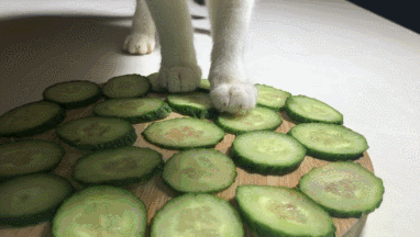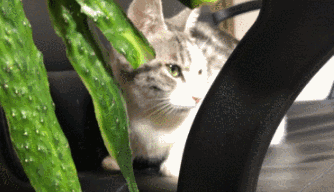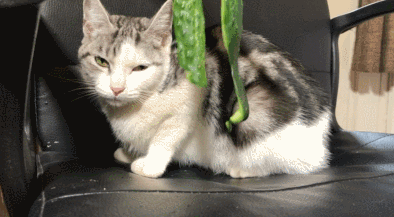 院辦看過那些動態照片,發現的確很蹊蹺,似乎貓會把黃瓜視作可怕到極點的邪惡大怪物——儘管黃瓜作為一種植物,本身連自由行動的能力都沒有。但貓一見到它們,就驚嚇到失去理智 ▽