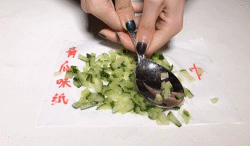 用勺子舀青瓜碎於紙巾表面,用一定的力度擠壓青瓜,使其汁液(當然了,我們要的主要是汁液中瀰漫出的黃瓜香)浸漬於紙巾上。