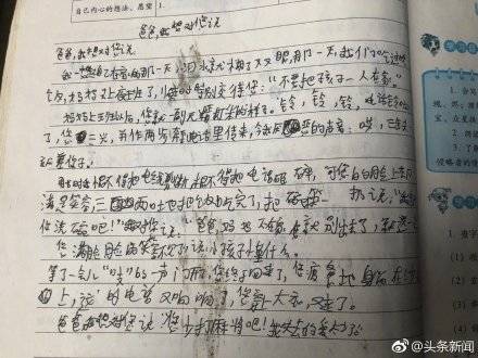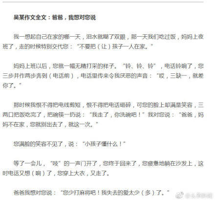 吳某五年級時寫的作文中提到了母親上夜班後,父親接到朋友電話後執意外出打麻將的事,他請求父親“別出去了,就這一次”,但遭到拒絕,他在文末寫道“爸爸,您少打麻將吧,我失去的愛太少(記者注:此處意為‘多’)了。”
