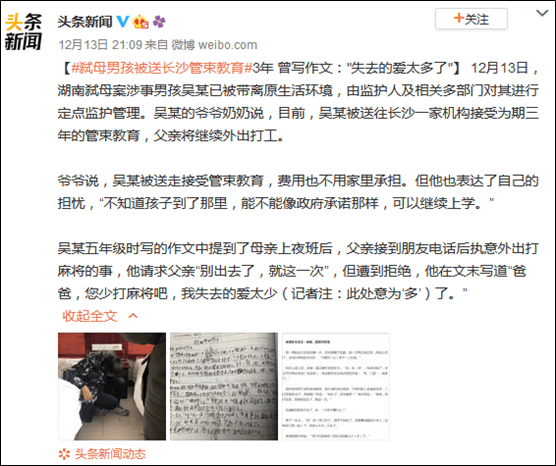 【#弒母男孩被送長沙管束教育#3年 曾寫作文:“失去的愛太多了”】 12月13日,湖南弒母案涉事男孩吳某已被帶離原生活環境,由監護人及相關多部門對其進行定點監護管理。吳某的爺爺奶奶説,目前,吳某被送往長沙一家機構接受為期三年的管束教育,父親將繼續外出打工。