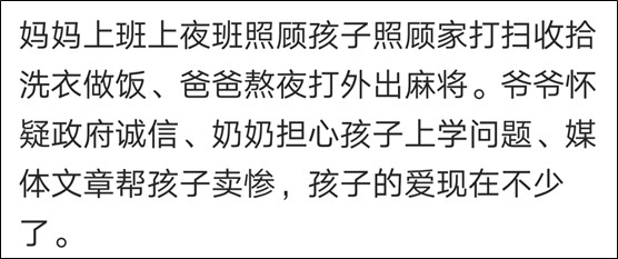 除了以上的那些問題,還有一個重點應該關注:不是家庭和政府共同管教的嗎?他爸爸為啥又出去打工了?