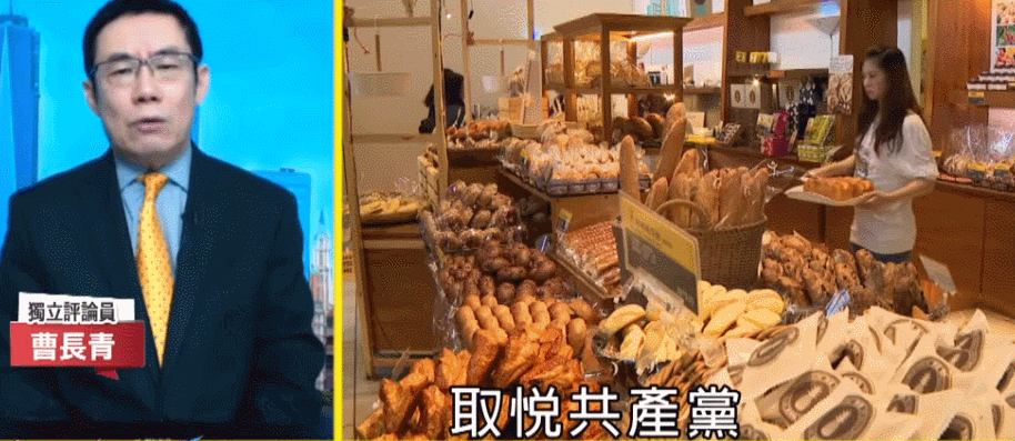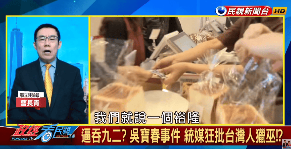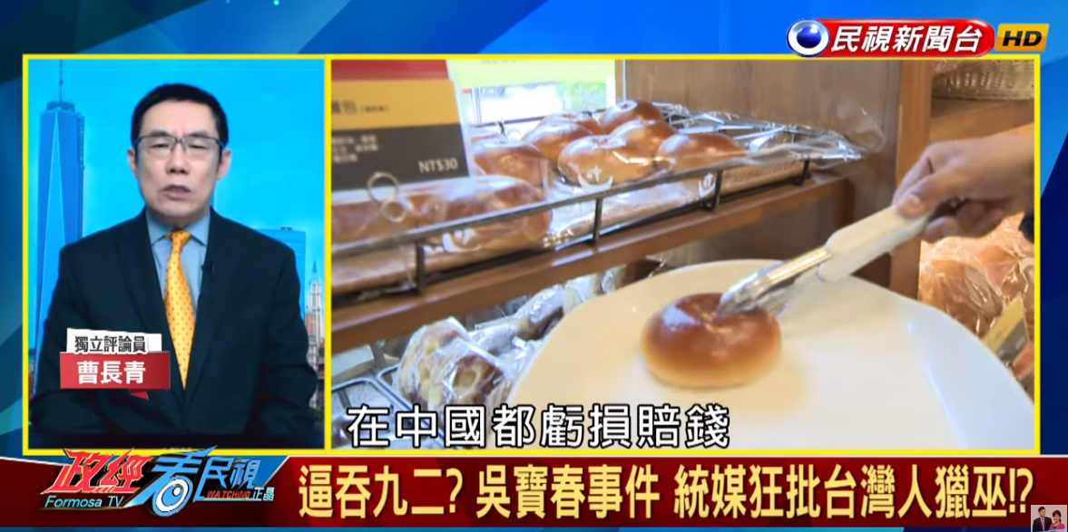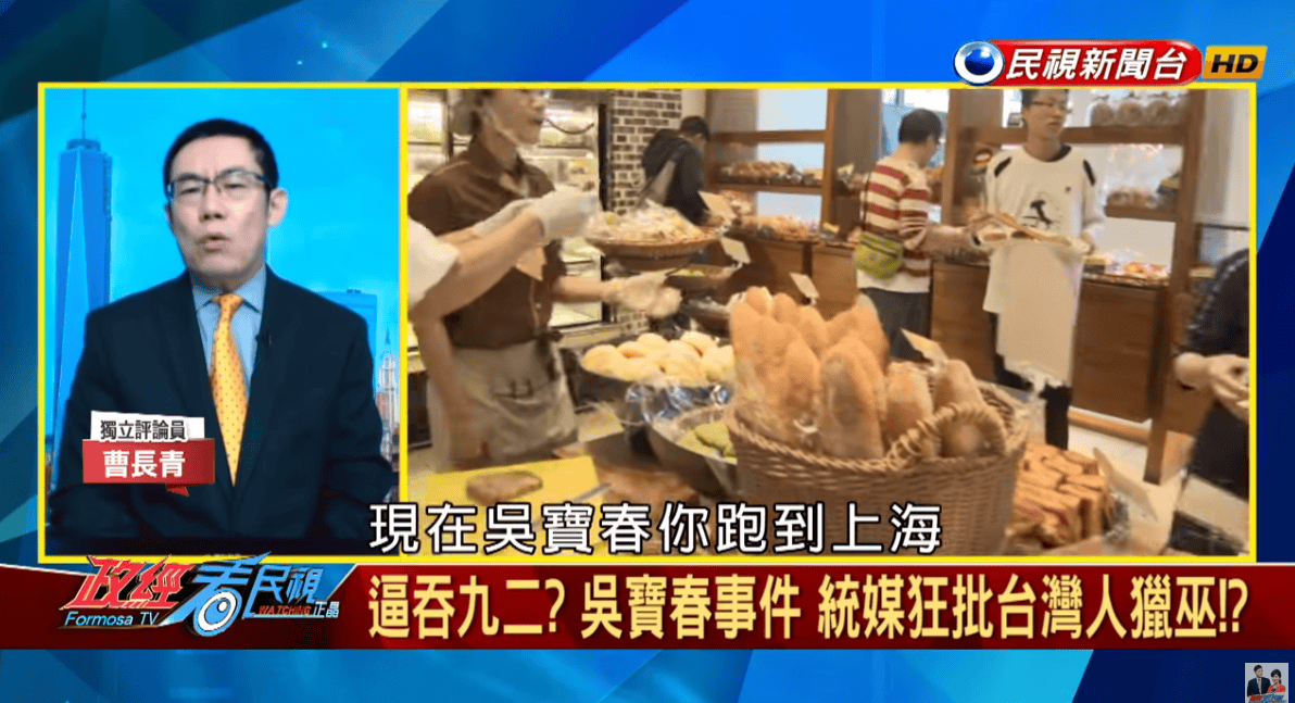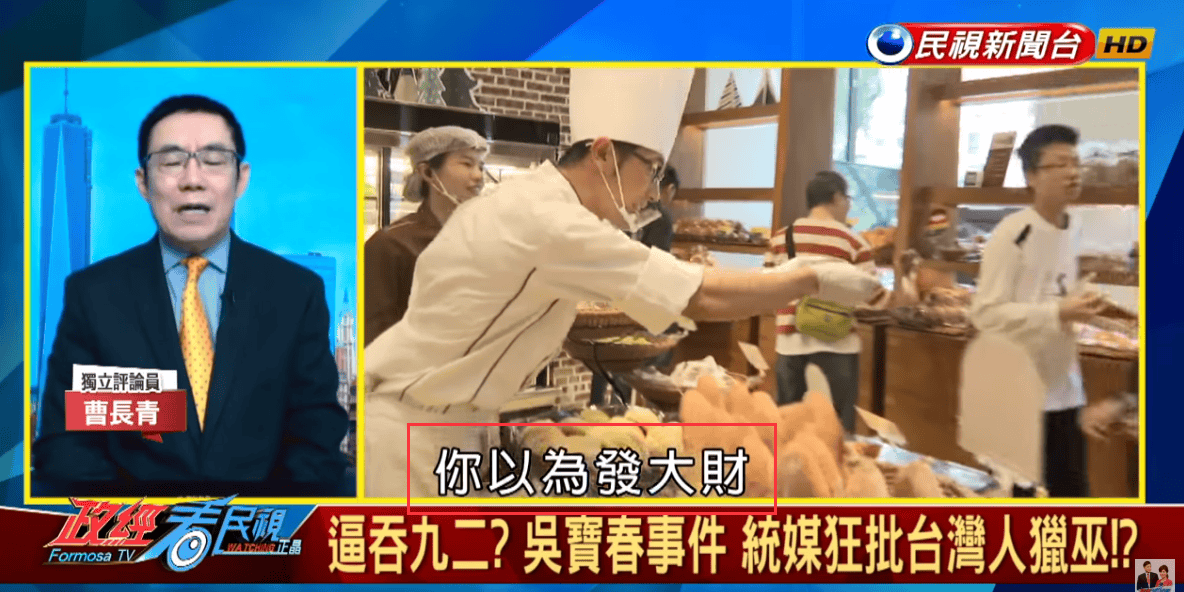曹科長説麪包師吳寶春發表聲明,支持九二共識,認為自己是中國人,就是諂媚共產黨,他還抨擊泛藍的媒體也跟着起鬨。