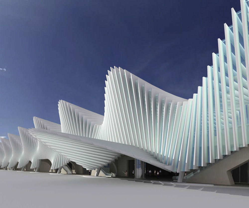 魔幻但友好的遠古怪獸一樣的造型是Santiago Calatrava的招牌手法。但他畢竟是搞結構的出身,不會給結構工程師出不可能的難題,看似漂浮的整片荷葉一樣的結構其實在中間有一個很不起眼的支承,重量還是落在下面的“殼體”上,否則單點斜臂再粗壯也難以硬撐