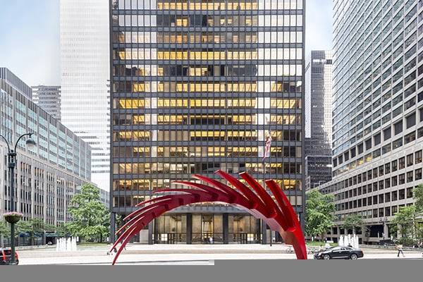 入夜後,不斷變換的彩色燈光打到現代派雕刻上,與建築交映生輝