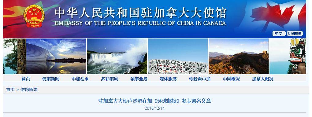 【環球網快訊】中國駐加拿大使館網站14日消息,2018年12月13日,中國駐加拿大大使盧沙野大使在加《環球郵報》發表題為《我們不希望看到加拿大走上背離公平正義的道路》的署名文章,稱孟晚舟被無端拘押事件不是簡單的司法案件,而是有預謀的政治行動,是美國動用國家權力對一家中國高科技企業的政治追殺;盧沙野大使還表示,“加拿大本來在廣大中國人民心目中有着很好的國家形象,但加方此次做法讓中國人民寒心。”