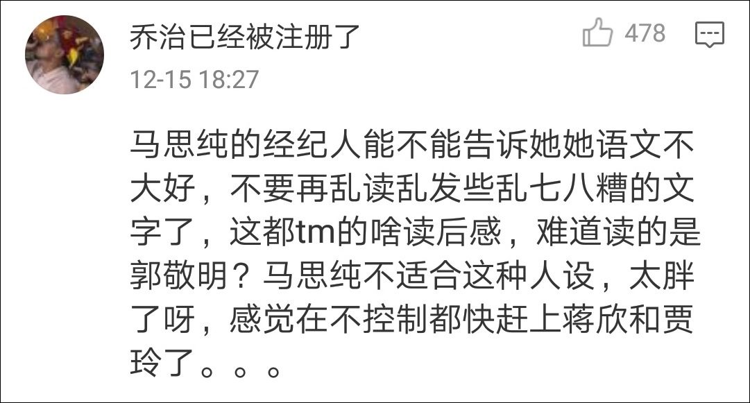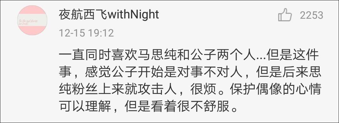 有網友認為,馬思純明顯表現得更為理智,倒是燕公子一開始diss人,居高臨下、自以為是,不知道是出於什麼心態。也有網友認為馬思純顯然就是沒讀幾本書的代表,還是應該豐富一下自己的修養再説話吧。