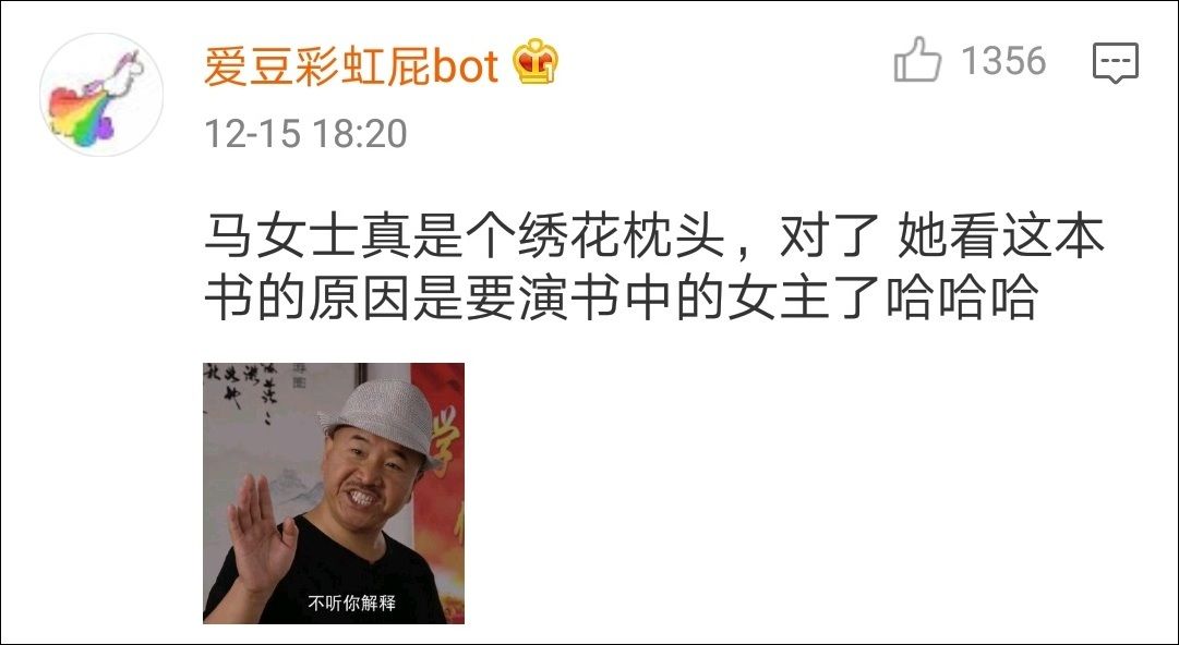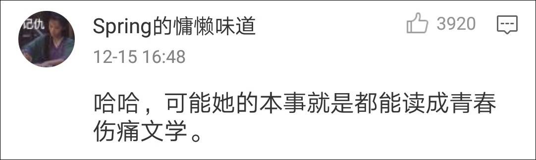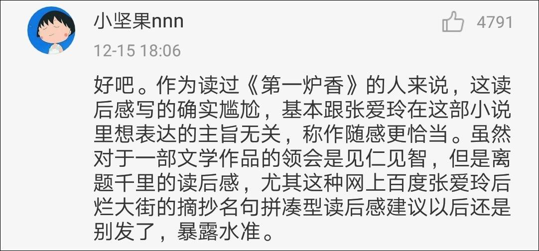 甚至有網友就直接説,可能馬思純的本事和她對於文學的理解,就是能夠把所有的經典書籍都讀成青春傷痛文學。尤其是張愛玲在完成《第一爐香》的時候,張愛玲根本都還沒有遇到胡蘭成,不知道愛一個人可以低到塵埃裏,又是從何談起。