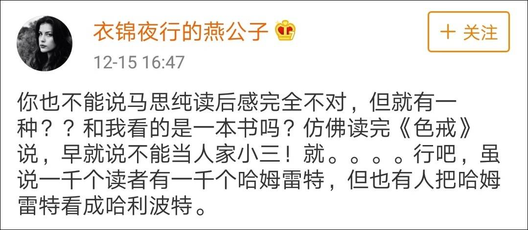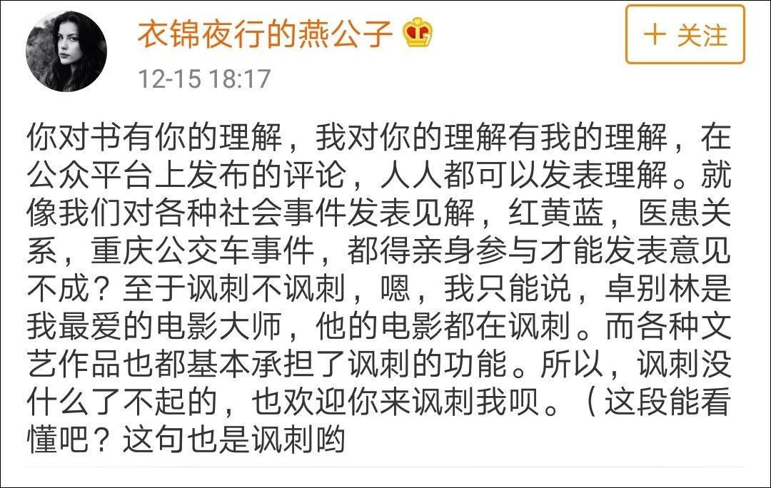 不過,這段頗為文藝的感想卻讓知名博主@衣錦夜行的燕公子 大感不適。