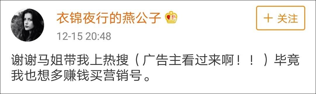 到了晚上時分,燕公子第三度發文,“謝謝馬姐帶我上熱搜,(廣告主看過來啊)畢竟我也想多賺錢買營銷號”。