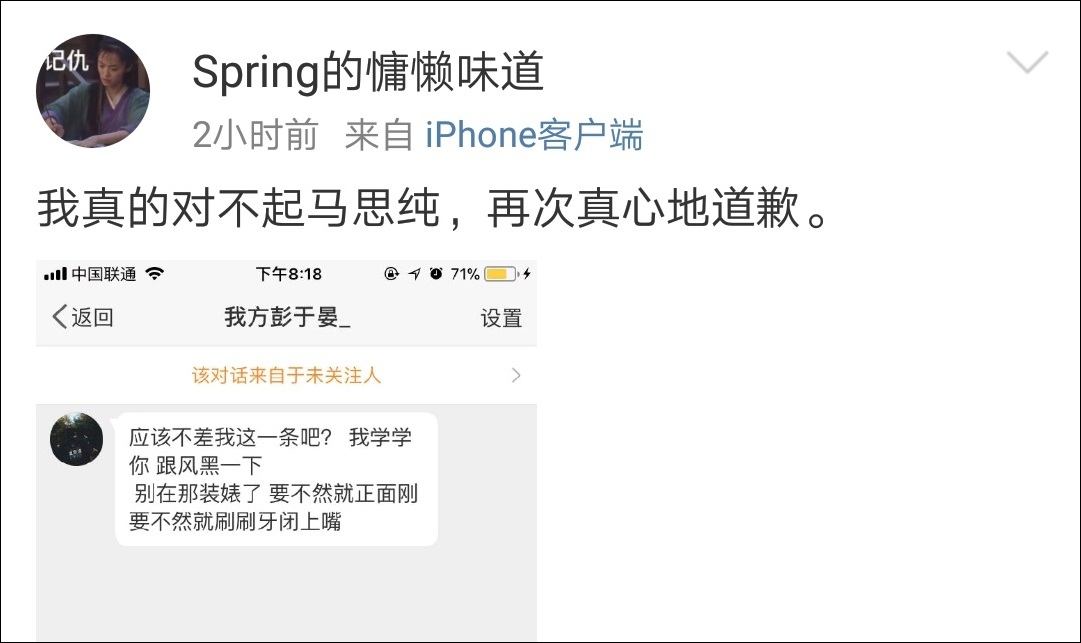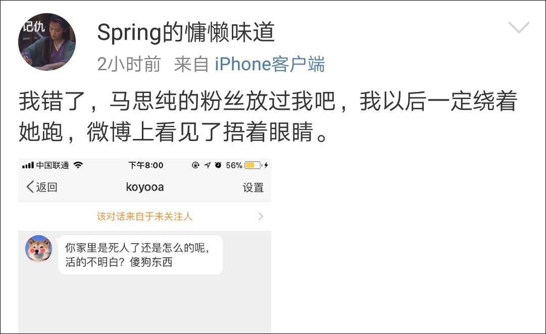 據瞭解,在這一來一回之下,#馬思純回懟燕公子#的話題迅速登上了熱搜榜。而網友@Spring的慵懶味道 也因為接到了太多來自馬思純粉絲的私信謾罵,而不得不“告饒”。