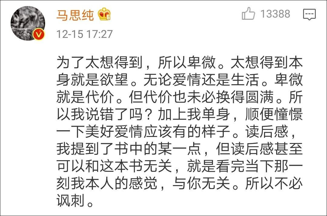 馬思純説,自己現在單身,憧憬一下美好愛情應該有的樣子,何錯之有。“讀後感,我提到了書中的某一點,但讀後感甚至可以和這本書無關,就是看完當下那一刻我本人的感覺。與你無關,所以不必諷刺。”