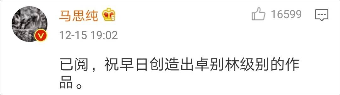 燕公子傍晚時再次發表“卓別林是我最愛的電影大師,他的電影都在諷刺。”馬思純回覆:“已閲,祝早日創造出卓別林級別的作品。”