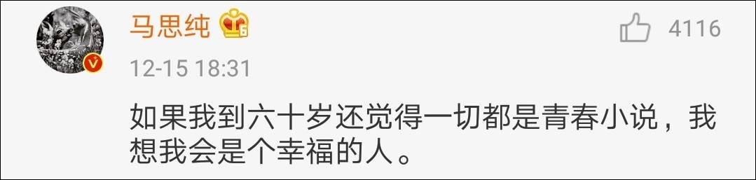 對此馬思純回應説,“如果我到六十歲還覺得一切都是青春小説,我想我會是個幸福的人。”
