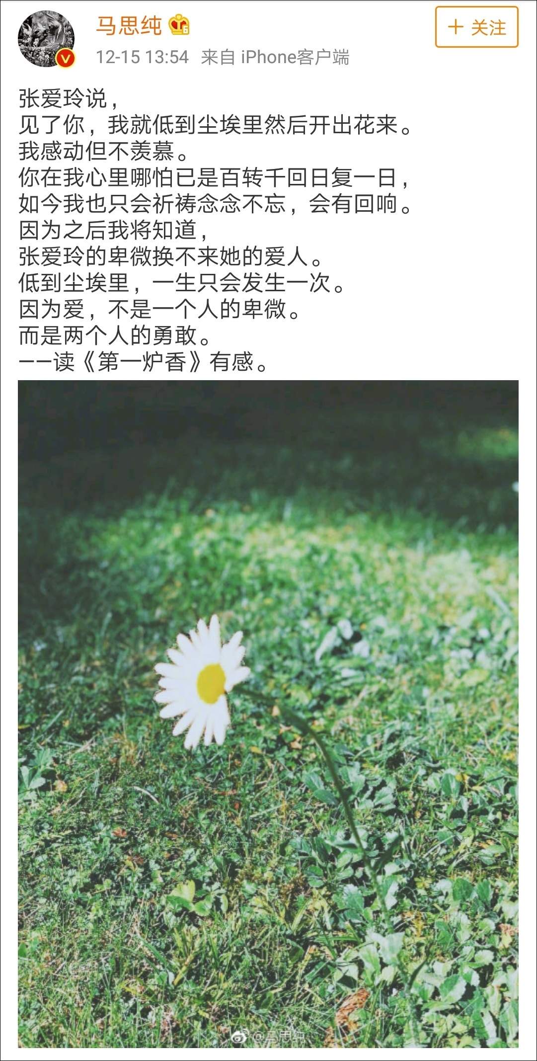 事情起於今天下午,馬思純在微博上分享了自己對於《第一爐香》的讀後感。