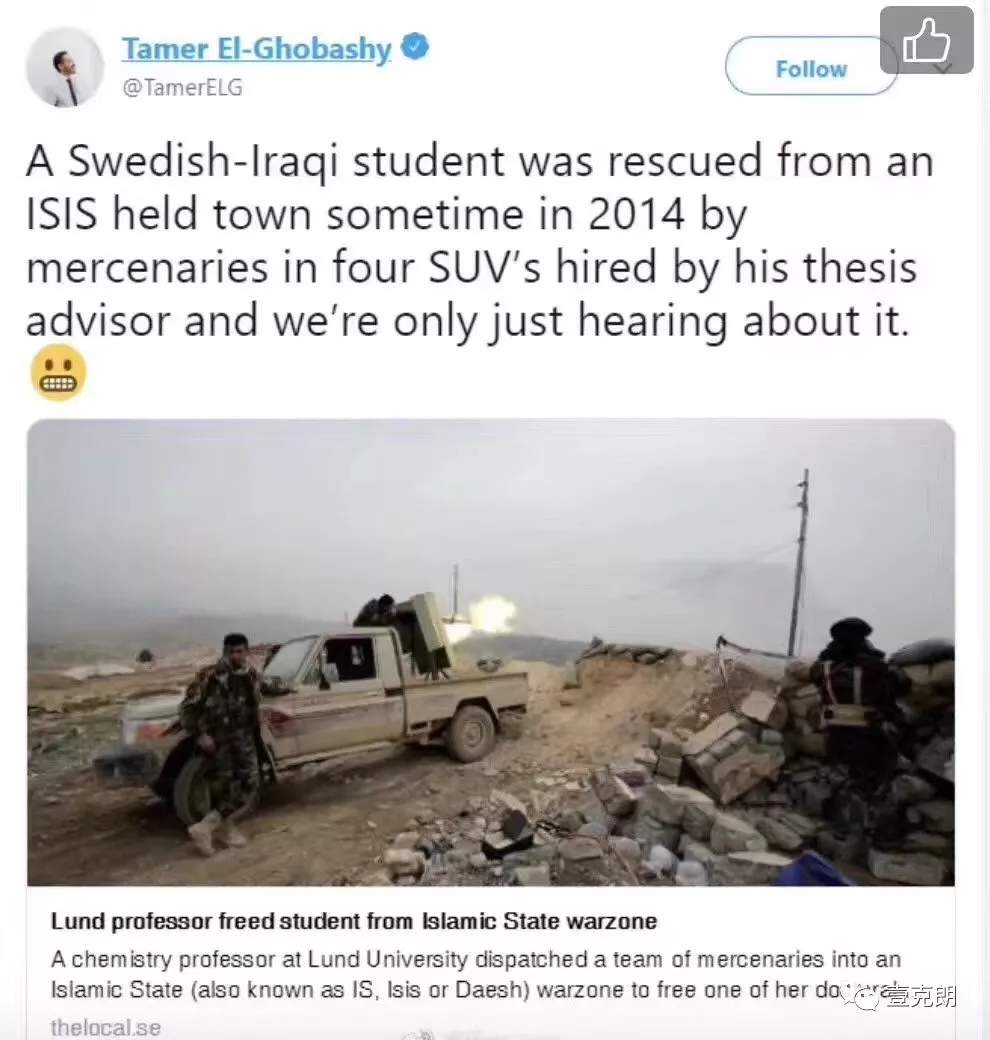 原因很簡單,一位讀分析化學的伊拉克籍博士生聽説ISIS一路屠城,已經逼近自己家鄉,於是請假回去想把家人接回瑞典。不料剛回去也被困住,在絕望之餘用短信向自己遠在瑞典的導師道別,以為人生到此為止。結果女教授得知後發現這老兄論文還沒寫完,居然還有掛科,於是和隆德大學相關負責人協商後,透過一家安保公司,派遣僱傭兵直接殺入敵區核心,強行將博士生一家救回瑞典。
