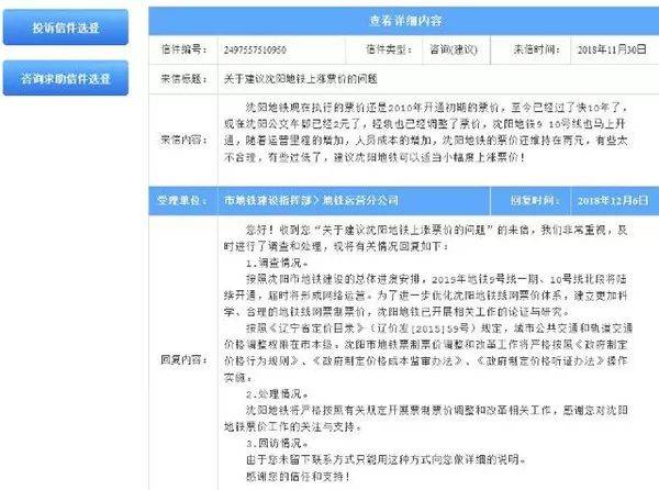 記者注意到,近日,有瀋陽市民通過12345市民服務熱線暨營商環境訴求平台吐槽瀋陽地鐵票價太低,並建議適當上漲,“瀋陽公交車都已經2元了,輕軌也已經調整了票價,瀋陽地鐵9、10號線也馬上開通,隨着運營里程的增加,人員成本的增加,瀋陽地鐵的票價還維持在兩元,有些太不合理,有些過低了,建議瀋陽地鐵可以適當小幅度上漲票價!”
