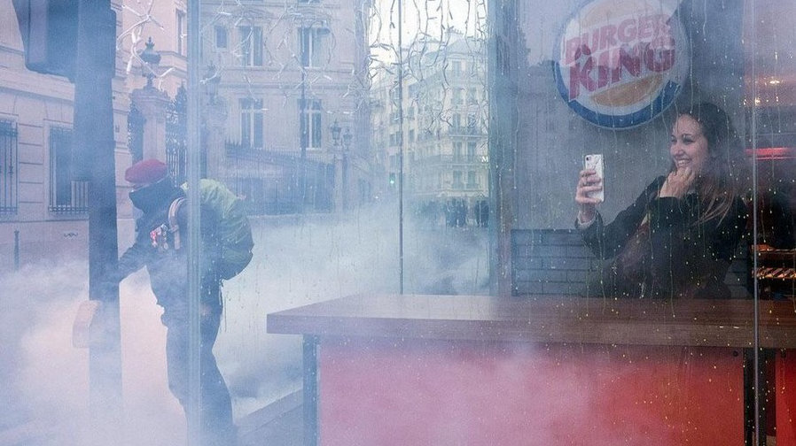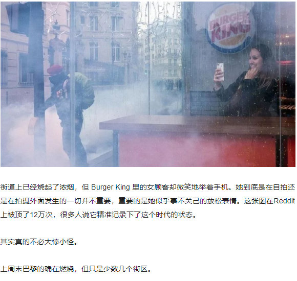 是的,這張照片被廣泛引用,一個女孩在一家漢堡王裏自拍,外面是巴黎街頭的硝煙