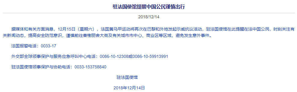 12月14日,中國大使館也再次發佈警告