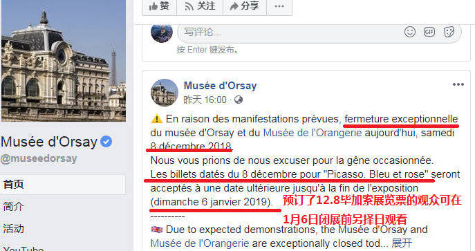 奧賽博物館在Facebook上提醒那些早就買好12月8日的票來看《畢加索展覽》的參觀者,在1月6日閉展前的任何一天都可以來