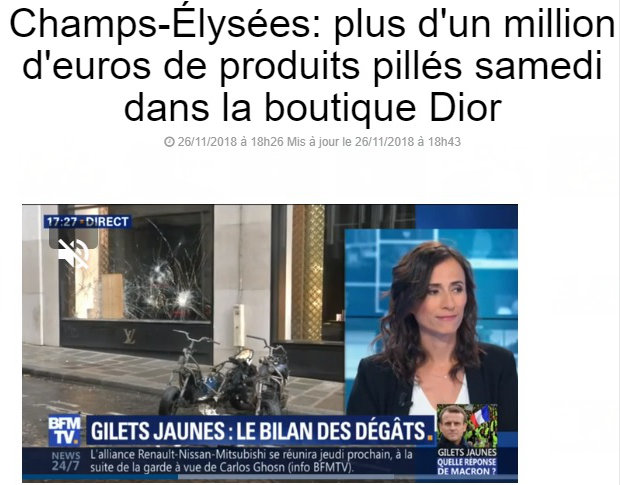 法國財政部長視察了一個被搶劫的社區商店,對記者説:抗議行動對法國經濟是一場災難,對巴黎商業是一場巨大的災難。他估計,最近的一系列黃馬甲,將讓法國經濟Q4減少0.1%的增長。
