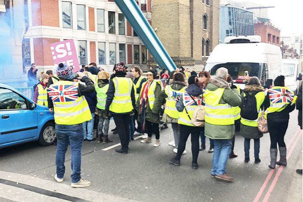他們的黃馬甲上還印着英國國旗——他們的訴求是英國馬上退出歐盟。