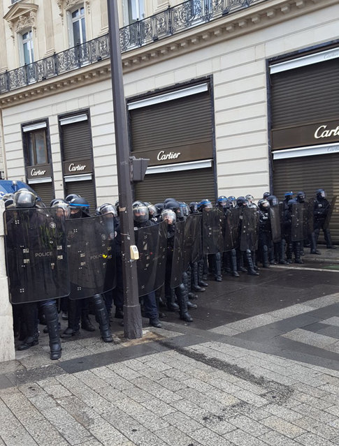 Severine Faucher,一位中年女性,站在香榭麗舍大街LV店的外面,警方發射的一枚催淚瓦斯就落在街對面,她幫助10歲的兒子戴好面具。