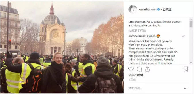 認識她嗎?《低俗小説》、《殺死比爾》的女主角。昨天,她在自己Ins上發了這張照片:“Paris, today. Smoke bombs and riot police coming in