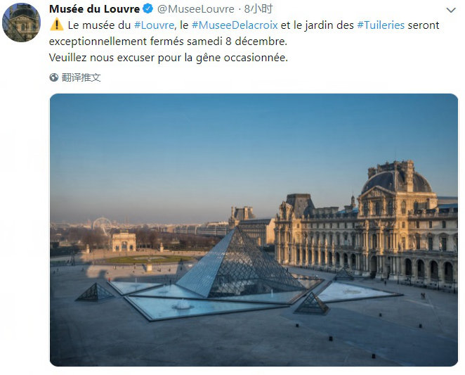 12月8日,埃菲爾鐵塔關門了,盧浮宮關門了,奧賽博物館關門了,蓬皮杜藝術中心關門了,巴黎歌劇院等很多劇場關門了,還有很多演出乃至法甲的比賽被推遲或取消了。