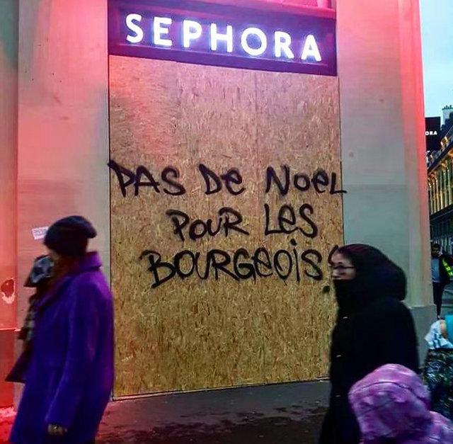 上週的黃馬甲運動中,巴黎一些店鋪的擋板上被噴塗了這樣一句話: