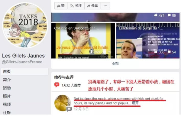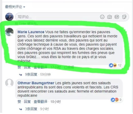 在推特和facebook上,輸入“黃馬甲”,有好幾個號稱所謂官方賬號,其中在臉書關注度最高的一個“黃馬甲”,在它發佈的一些推送下,有很多法國人在表達自己的不滿▼