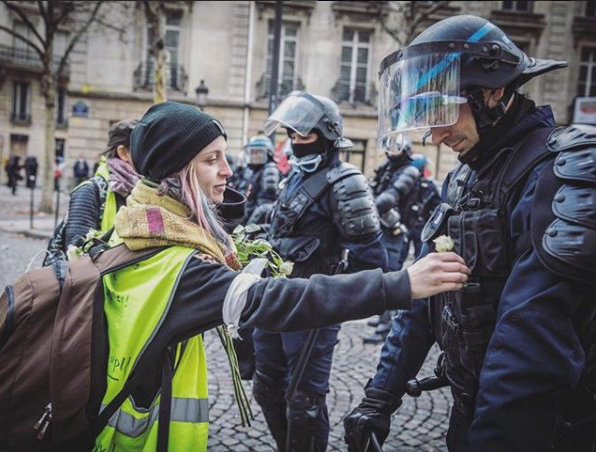 黃馬甲給防暴警察送上獻花是真的